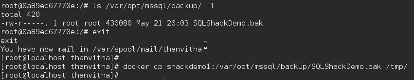 Now, exit the SQL Docker container instance, shackdemo2. Copy the backup file from the host machine to the shackdemo2 container.