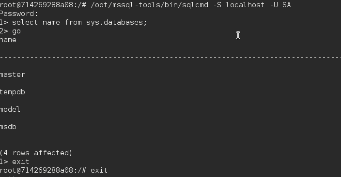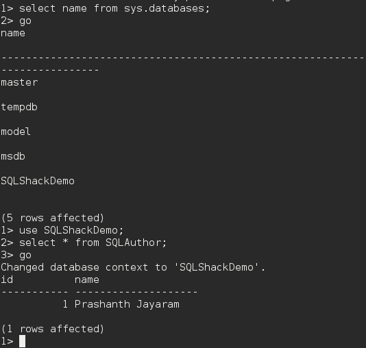 [root@localhost thanvitha]# docker run -e ‘ACCEPT_EULA=Y’ -e ‘MSSQL_SA_PASSWORD=SQLShack$2018’ –name shackdemo2 -p 1402:1433 -d microsoft/mssql-server-linux:latest 714269288a08da8775eb59dad6c5d4c2b2d6bad833043e81fcf4afc6586be7aa [root@localhost thanvitha]# docker exec -it shackdemo2 bash root@714269288a08:/# /opt/mssql-tools/bin/sqlcmd -S localhost -U SA Password: