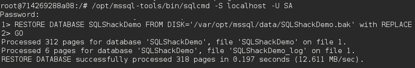 RESTORE DATABASE [SQLShackDemo] FROM DISK = N’/var/opt/mssql/data/SQLShackDemo.bak’ with REPLACE