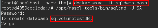 #docker exec –it sqldemo bash #/opt/mssql-tools/bin/sqlcmd –U SA –P thanVitha@2015 1>create database sqlvolumetestDB; 2>go |