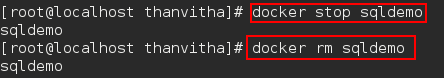 So far, we’ve created a database sqlvolumetestDB. Let’s go ahead quit SQL shell and exit out of the Linux shell. Now, go ahead and remove the container. Before that though, stop the container using docker stop command. Once it’s stopped, remove the sqldemo container using docker rm command but the volume still exists.