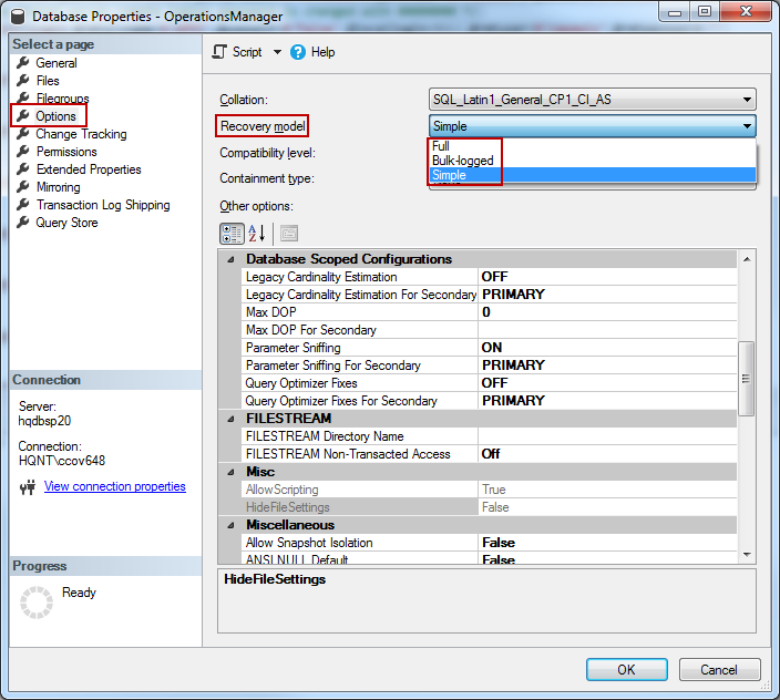 - To change the recovery model, select the desired recovery model: Full, Bulk-logged, or Simple from the drop-down list