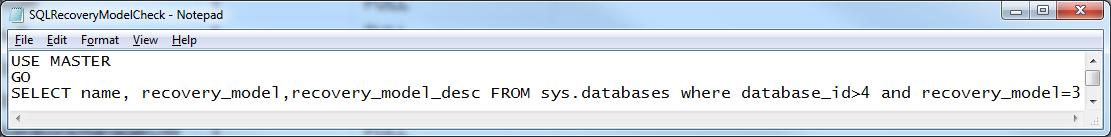 USE MASTER GO SELECT name, recovery_model,recovery_model_desc FROM sys.databases where database_id>4 and recovery_model=3 |