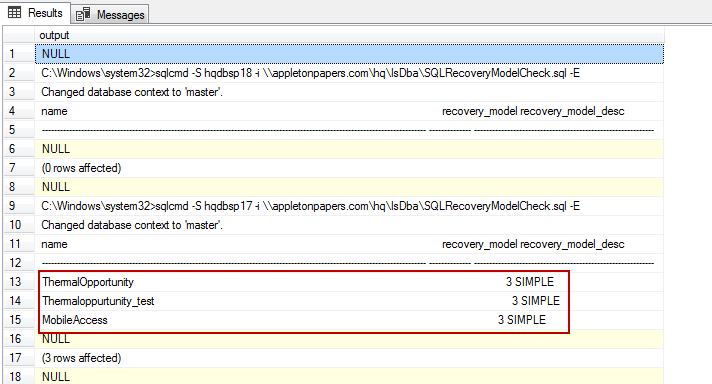 MASTER..XP_CMDSHELL 'for /f %h in (\\share\hq\inputserver.txt) do sqlcmd -S %h -i \\Share\hq\SQLRecoveryModelCheck.sql -E' |