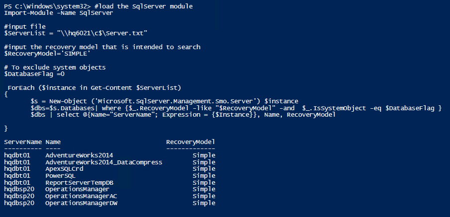 #load the SqlServer module Import-Module -Name SqlServer #input file $ServerList = "\\hq6021\c$\Server.txt" #input the recovery model that is intended to search $RecoveryModel='SIMPLE' # To exclude system objects $DatabaseFlag =0 ForEach ($instance in Get-Content $ServerList) { $s = New-Object ('Microsoft.SqlServer.Management.Smo.Server') $instance $dbs=$s.Databases| where {$_.RecoveryModel -like "$RecoveryModel" -and $_.IsSystemObject -eq $DatabaseFlag } $dbs | select @{Name="ServerName"; Expression = {$Instance}}, Name, RecoveryModel } |