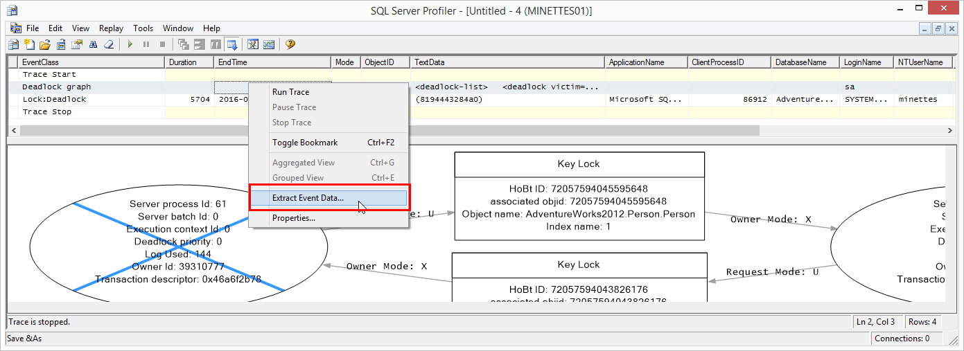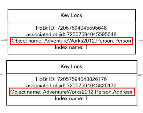 Next we can see which objects are involved in the deadlock. In this case the objects in question are AdventureWorks2012.Person.Person and AdventureWorks2012.Person.Address.