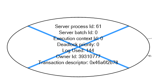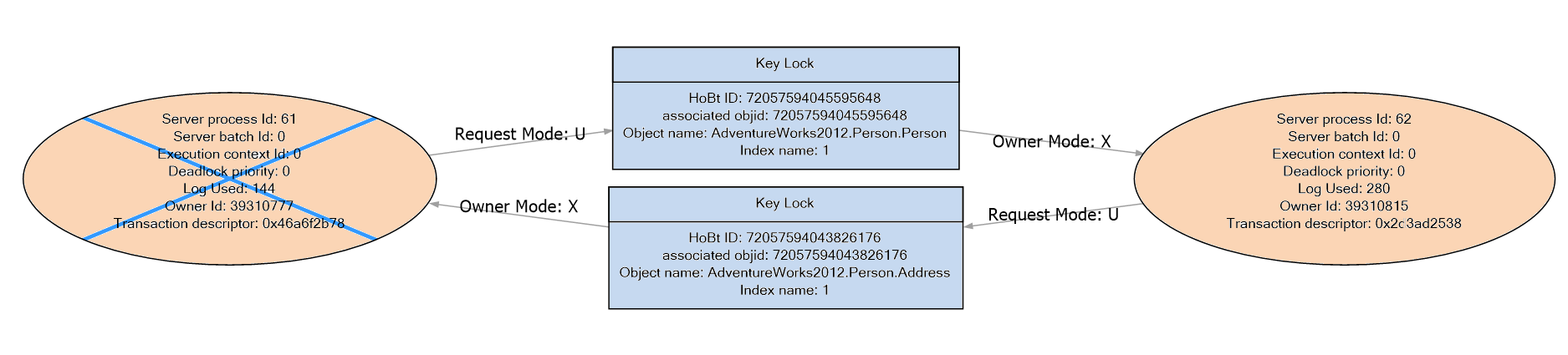 The most obvious information visible to us by looking at the Graph is that Process 61 was chosen as the deadlock victim. We know this because it is crossed out. It is also usually displayed on the left. SQL Server will choose the process with the lowest cost as the victim. One of the criteria is the amount of log used. Since both processes has a deadlock priority of 0 and Process 61 used less log than process 62, it can be rolled back faster and is therefore the victim in this case.