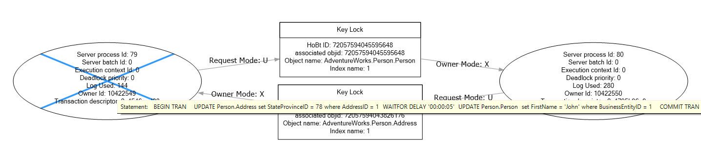 BEGIN TRAN UPDATE Person.Person SET FirstName = 'John' WHERE BusinessEntityID = 1 WAITFOR DELAY '00:00:05' UPDATE Person.Address SET StateProvinceID = 78 WHERE AddressID = 1 COMMIT TRAN |