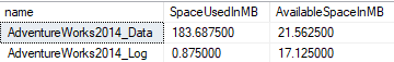 SELECT name, s.used / 128.0 AS SpaceUsedInMB, size / 128.0 - s.used / 128.0 AS AvailableSpaceInMB FROM sys.database_files CROSS APPLY (SELECT CAST(FILEPROPERTY(name, 'SpaceUsed') AS INT)) s(used) WHERE FILEPROPERTY(name, 'SpaceUsed') IS NOT NULL; |