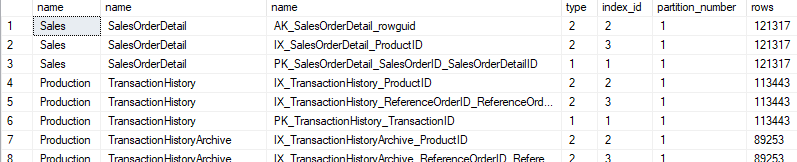 Without even considering the contents of these tables, you can see that the SalesOrderDetail table is the largest. It may be a good candidate for compression. By the way, the type column indicates the type of the index. 1 is for clustered indexes. 2 means a non-clustered index. 0 (not shown in this example) is a heap. Recall that a table is either a heap or a clustered index.