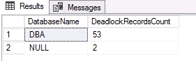 select TOP 5 DB_NAME(DatabaseId) as DatabaseName, COUNT_BIG(*) as DeadlockRecordsCount From dbo.ShreddedDL_Example group by DatabaseId order by 2 desc ; |