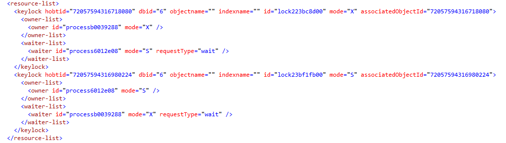 - The resource-list which lists database resources used by processes when deadlock situation occurred. Here is an example of its contents corresponding to current example.