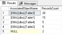 select TOP 5 AssociatedObjectName, COUNT_BIG(*) as RecordsCount From dbo.ShreddedDL_Example group by AssociatedObjectName order by 2 desc |