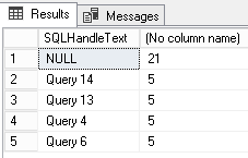 select TOP 5 SQLHandleText, COUNT_BIG(*) as RecordsCount From dbo.ShreddedDL_Example group by SQLHandleText order by 2 desc |