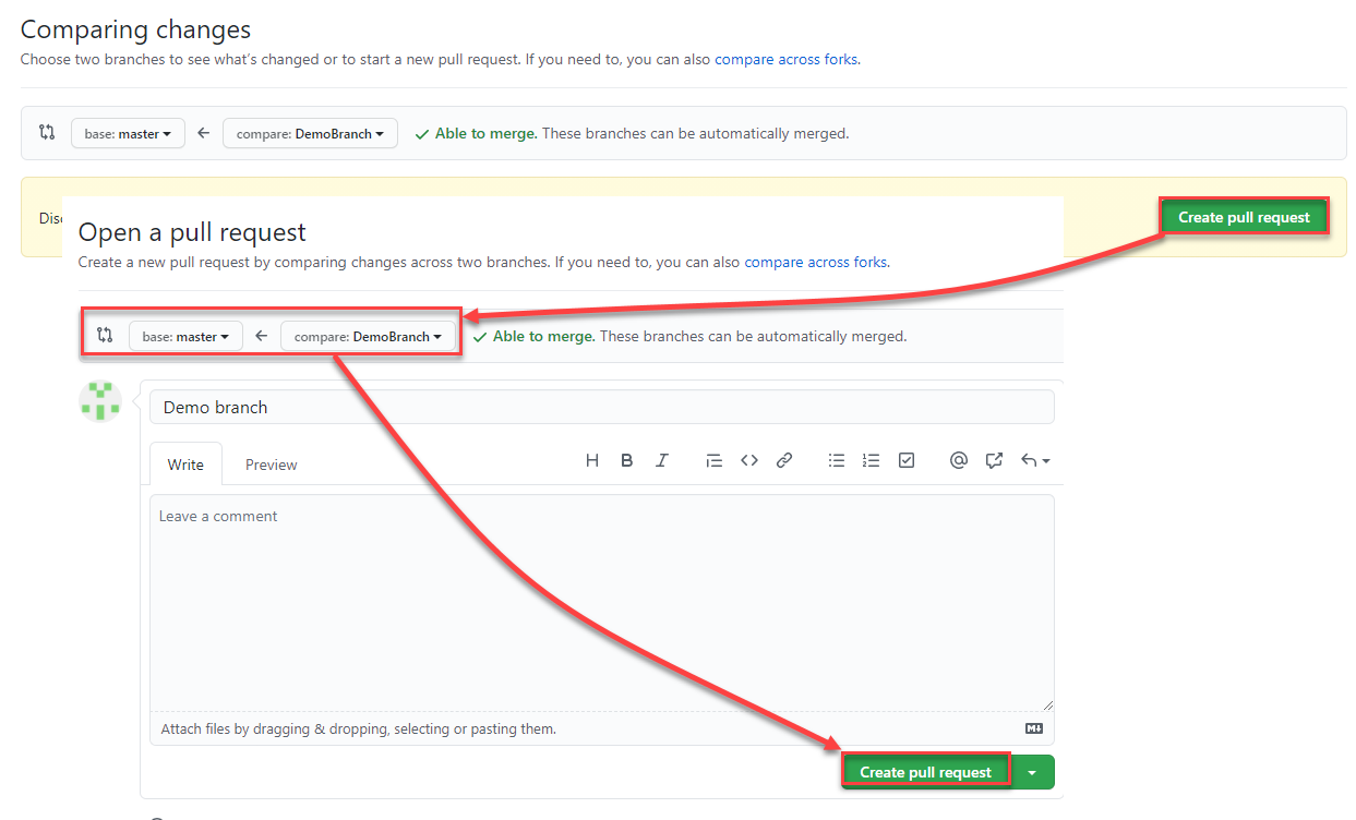 Which will open your GitHub account in a new tab, where you need to select the feature and master branches to compare the changes between them in the pull request, leave your comments if any, then click on Create Pull Request to proceed, as shown below: