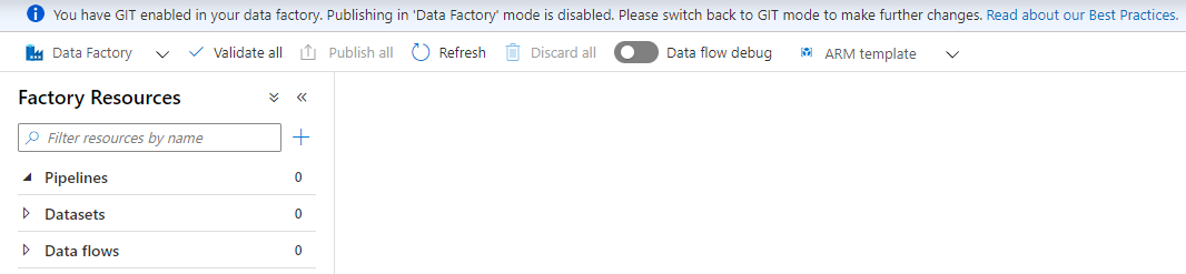 An important point to consider here is that, when the GIT mode is enabled in your data factory, publishing in the Data Factory mode will be disabled. So, in order to make any changes in your pipelines, you should switch back to GIT mode and publish the changes from there. This is clear from the warning message that we get if we try to switch to the Data Factory mode and start working there, as shown below: