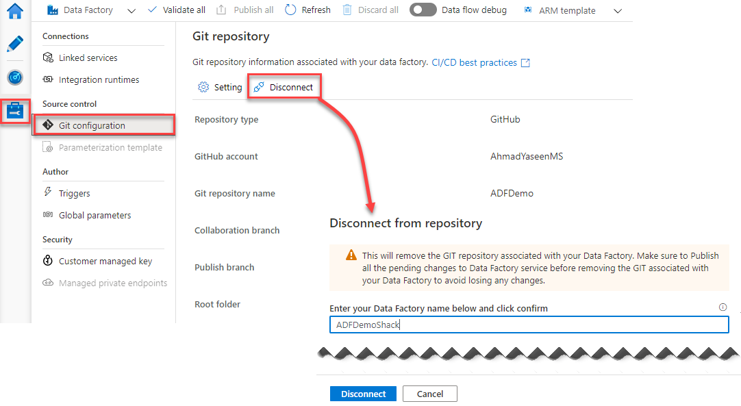 The Git repository can be disconnected from the Azure Data Factory by browsing to the Manage window, and from the Git Configuration list click on the Disconnect button, where you will be asked to provide the name of your Data Factory as a confirmation for the disconnection process, as shown below: