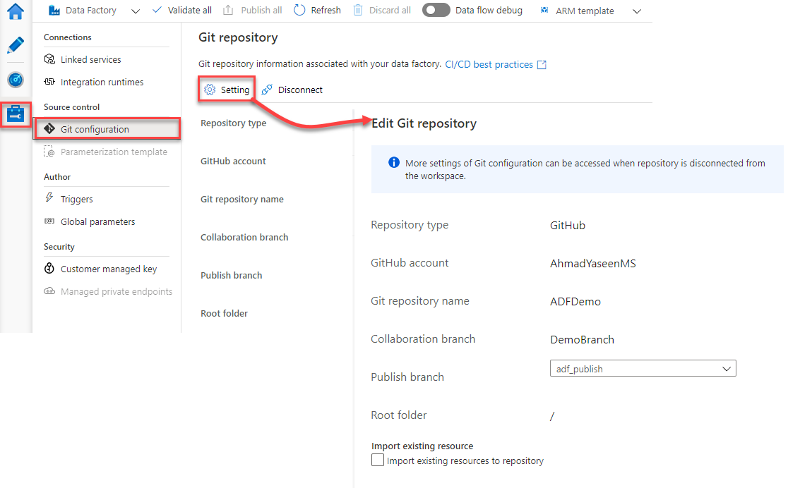 Azure Data Factory allows you to perform limited changes in the Git repository that is associated with the Azure Data Factory. To change the publish branch or import resources to the repository, browse to the Manage window, and from the Git Configuration list click on the Settings button, as shown below:
