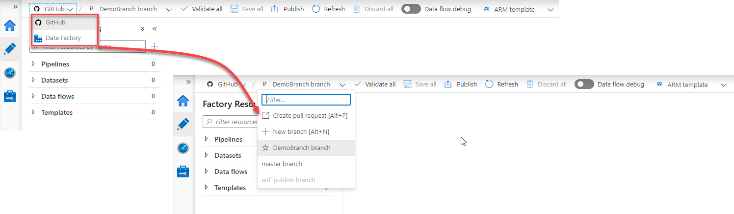 Then, we need to review the code and merge the changes from the feature branch to the collaboration branch, which is the master branch, from where we can perform the publish to the Data Factory service. To perform the merge, choose the Create pull request option from the branch dropdown list, as below: