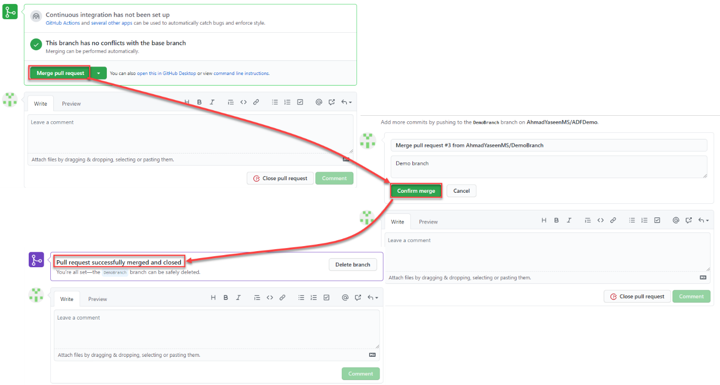 Now, the list of code changes will be displayed, so that you will be able to review these changes, leave any comments then perform the merge operation between the feature and collaboration branches. Notice that, like any development source control, performing changes in the code requires reviewing the code changes by the authorized team then approving these changes before publishing it to the production environment, as shown below: