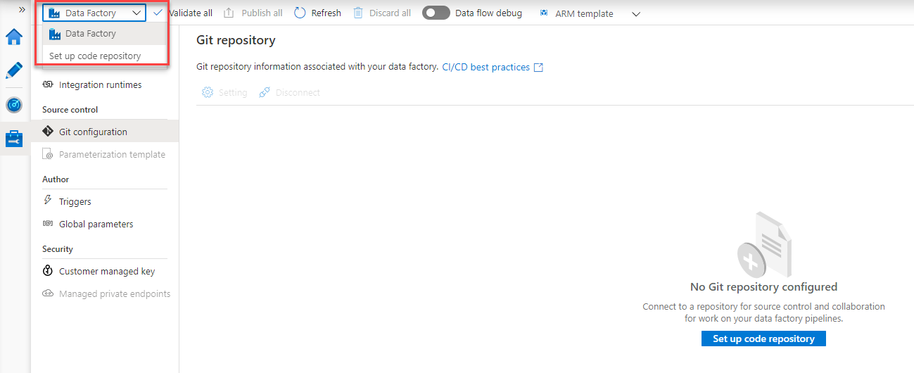 If not configured yet, you can set up the code repository by opening the Azure Data Factory from the Azure portal then choose the Author and Monitor option. From the opened Data Factory page, click on the Set up code repository option, to connect the Data Factory to a GIT repository, as shown below: