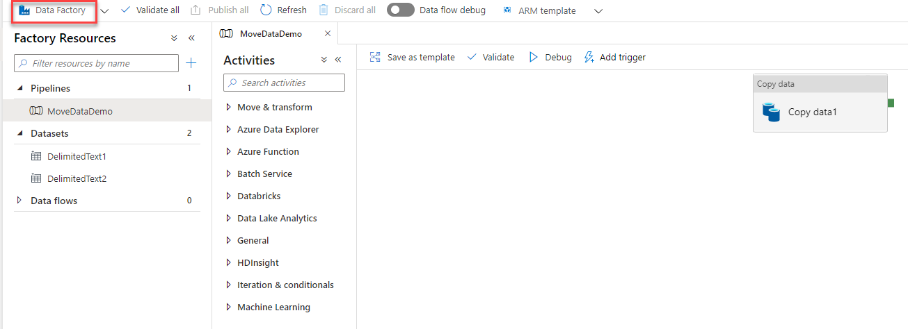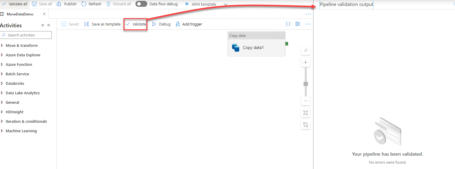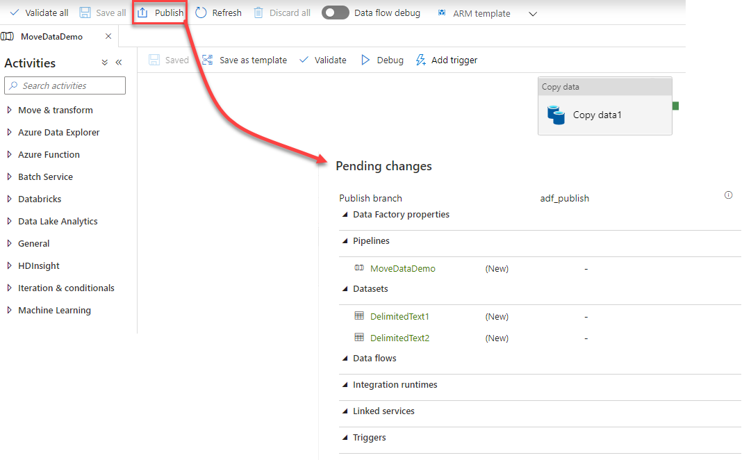 After performing all required changes and test the pipeline using the Debug option, it is time to publish the pipeline and the related components to the Data Factory mode.