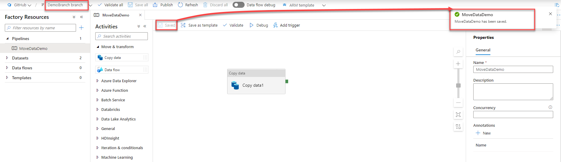 To confirm that the pipeline changes are published successfully, in addition to the notification that you will receive from the Azure Portal, you can switch to the Data Factory mode and review the created pipeline and the latest changes performed on that pipeline, as shown below: