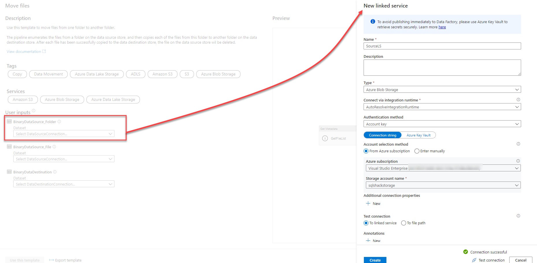 If you decide to use that pipeline template, you need to select an existing or create a new Linked Service for each source and sink required in the selected pipeline template, from the same window, and validate the connection properties for each created Linked Service, using Test Connection option, as shown below: