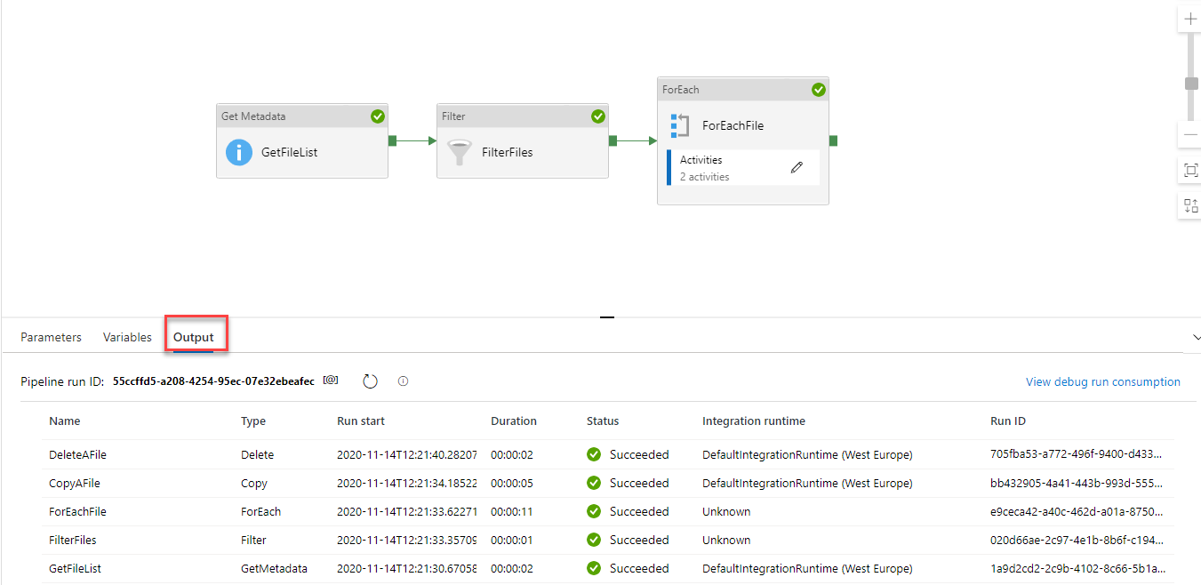 The pipeline execution can be monitored from the Output tab that shows useful information about the execution of each activity from the Data Factory pipeline, as shown below: