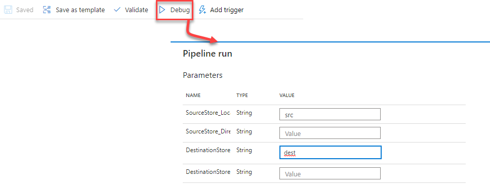 In this demo, we will test the pipeline using the Debug option, from the pipeline Author window, then provide all the required parameters for the pipeline execution, as shown below:
