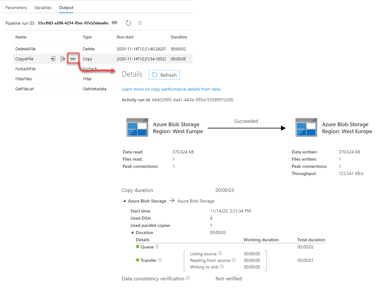 In addition to the detailed view of the copy activity, in which you can see the amount of data copied between the source and destination data stores, the throughput of the copy process, the consumed resources and time that the activity spent in the queue and in transferring the data, as shown below: