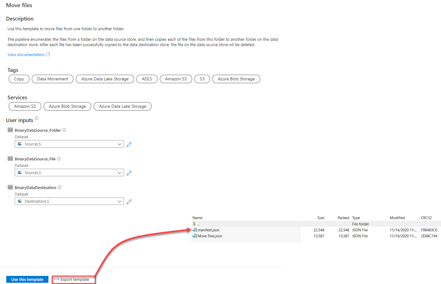 When you save the predefined data Factory pipeline template, it will generate two JSON files, an ARM template and a manifest file. The manifest file contains information about the template description, template author, template tile icons and other metadata about the selected template.