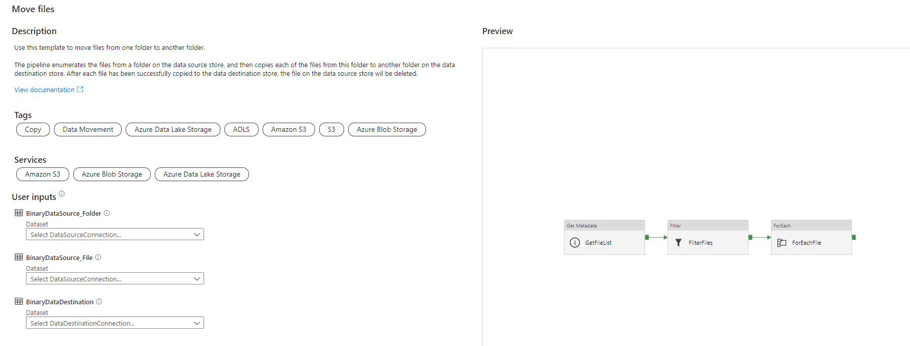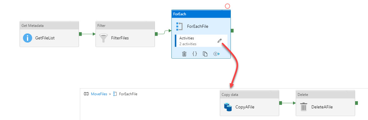 For example, the selected MoveFiles pipeline template consists of three main activities, the GetFileList activity that is used to return the list of files exist in the source data store, the Filter activity that ensures that only files will be selected from the source data store, without considering the folders, and finally the ForEach activity that loops through all the source files, copy it to the destination datastore then delete it from the source data store, as shown below: