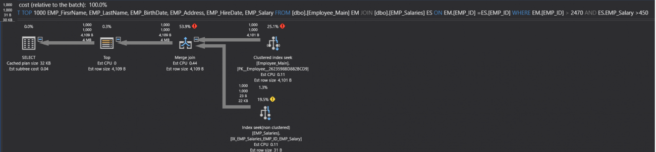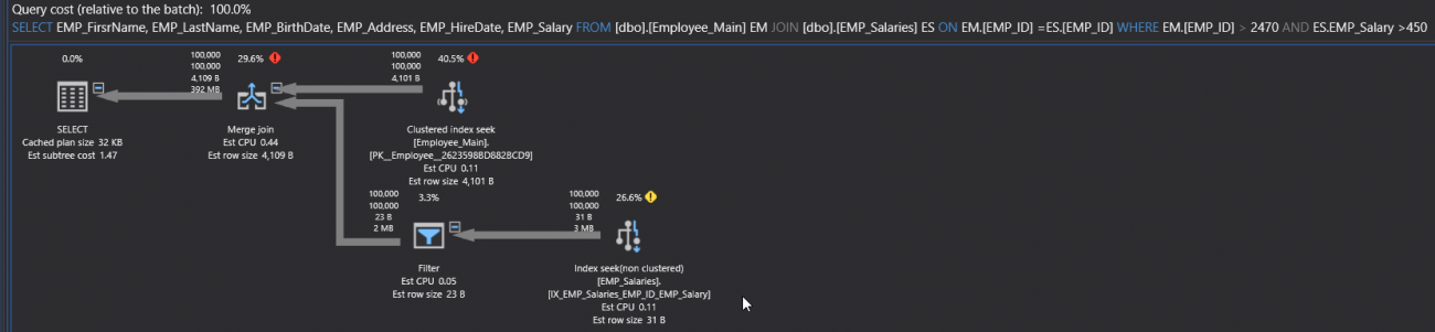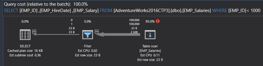 At this step, the enhancement that can be performed in the query performance, can be achieved by writing the query in a better way. For example, the thickness of the arrow can be reduced using the TOP clause that limits the number of returned rows. On the other hand, the Filter operator can be removed by creating a new index on the EMP_Salaries table, using the CREATE INDEX T-SQL statement below: