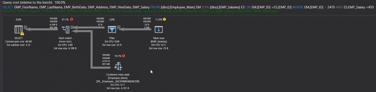 If you execute the SELECT query, including the Actual Execution Plan of the query. You will see from the generated plan number of performance issue signs, such as the Table Scan operator, due to scanning the overall underlying table, the fat arrow, due to large number of rows flowing between the operators and the extra expensive operators such as the Hash Match operator, as shown in the SQL Execution Plan below:
