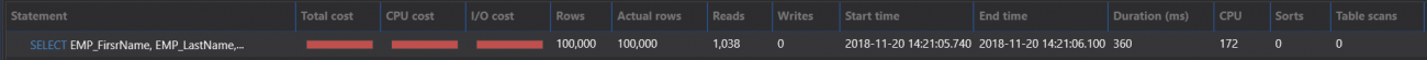 Checking the execution statistics of the query, you will see the large number of reads, the long duration and the high CPU cost, as shown below: