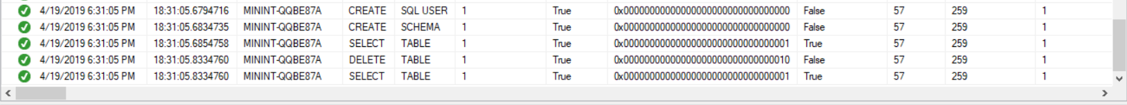 For example, the previously executed CREATE USER statement, the newly created database schema and the executed SELECT, INSERT and DELETE statements are audited and logged by the SQL Server Audit built-in tool, with useful details that describe when the action is performed, the type of that operation, the name of the principal who performed this change, the server name from which the command executed, the database name, whether this operation is completed successfully or failed, the executed statement and more useful information, as shown below: