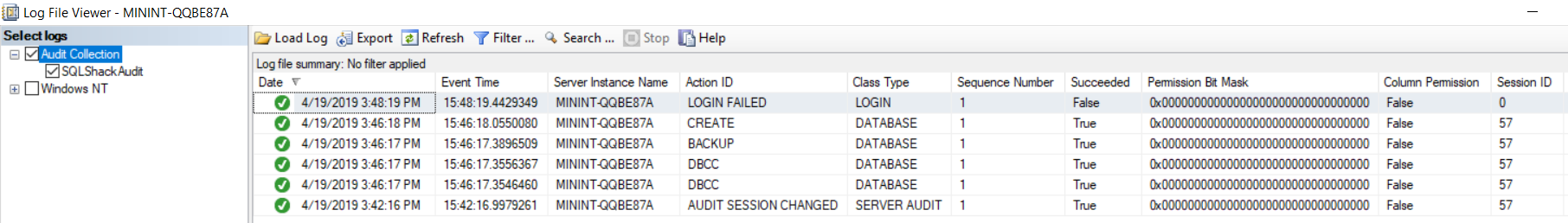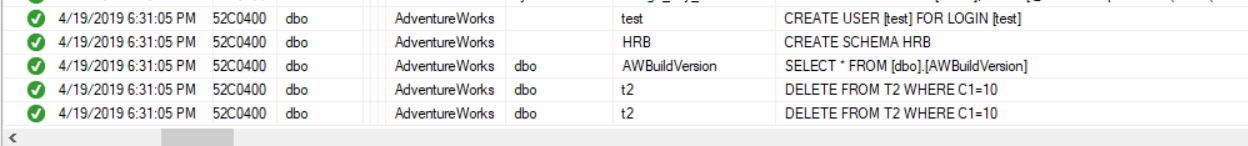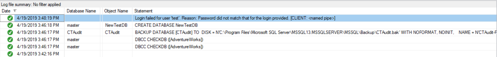 From the Log File Viewer, you can see that all the performed actions will be caught by the SQL Server Audit feature and logged to the SQL Server Audit target, as below: