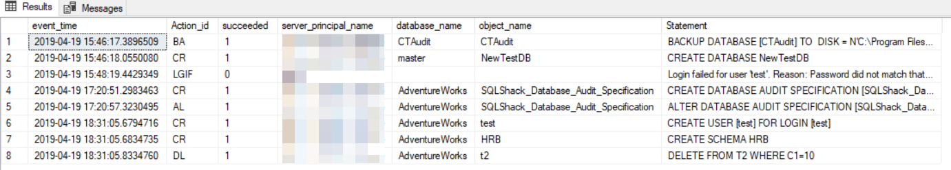 For example, the previously executed DBCC command, the performed database backup operation, the newly created database and the failed login attempt are audited and logged by the SQL Server Audit built-in feature, with complete details about the action date time, the operation type, the principal name, the server name, the database name, if the operation is completed successfully or failed, the executed statement and other useful information, as shown clearly below: