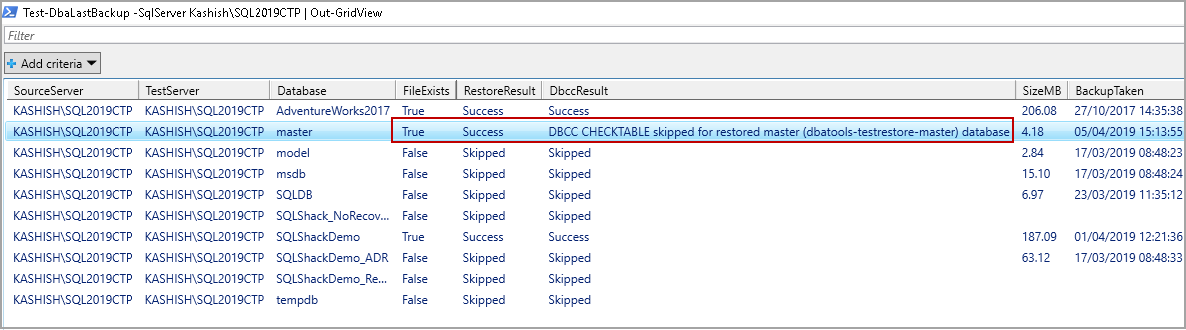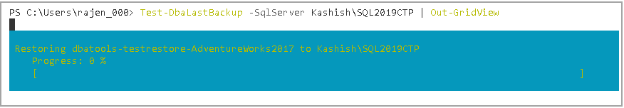 >Test-DbaLastBackup -SqlServer Kashish\SQL2019CTP -Databases AdventureWorks2017 -Prefix DRDrill -DataDirectory C:\TEMP\Backup -LogDirectory C:\TEMP\Backup | Export-CSV c:\temp\results.csv -NoTypeInformation |