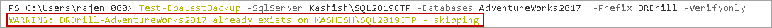 >Test-DbaLastBackup -SqlServer Kashish\SQL2019CTP -Databases AdventureWorks2017 -Prefix DRDrill -Verifyonly |
