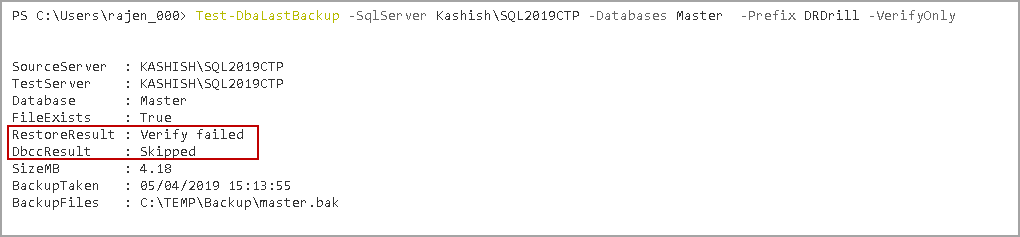 >Test-DbaLastBackup -SqlServer Kashish\SQL2019CTP -Databases Master -Prefix DRDrill -VerifyOnly |