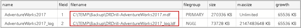 Verify file locations using the sp_helpfile command in a restored database. In the following screenshot, we can verify files exist in specified directories.