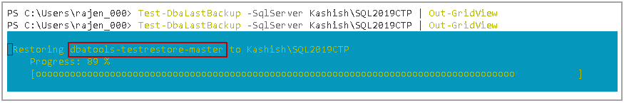 >Test-DbaLastBackup -SqlServer Kashish\SQL2019CTP -Databases AdventureWorks2017 -Prefix DRDrill -NoDrop -DataDirectory C:\TEMP\Backup -LogDirectory C:\TEMP\Backup |