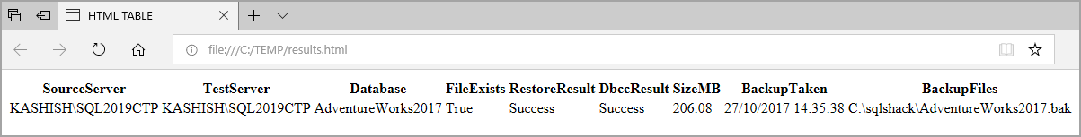 >Test-DbaLastBackup -SqlServer Kashish\SQL2019CTP -Databases AdventureWorks2017 -Prefix DRDrill -DataDirectory C:\TEMP\Backup -LogDirectory C:\TEMP\Backup | ConvertTo-Html | Out-File c:\temp\results.html |
