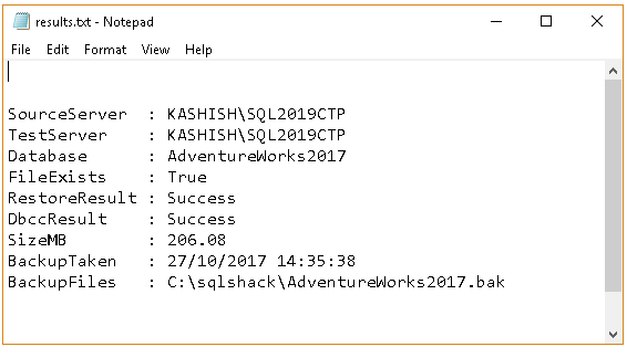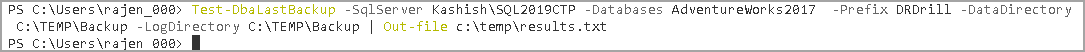 >Test-DbaLastBackup -SqlServer Kashish\SQL2019CTP -Databases AdventureWorks2017 -Prefix DRDrill -DataDirectory C:\TEMP\Backup -LogDirectory C:\TEMP\Backup | <strong>Out-file c:\temp\results.txt</strong> |