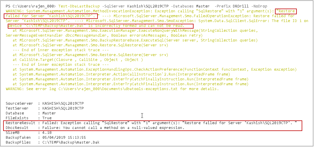 >Test-DbaLastBackup -SqlServer Kashish\SQL2019CTP -Databases Master -Prefix DRDrill -NoDrop |