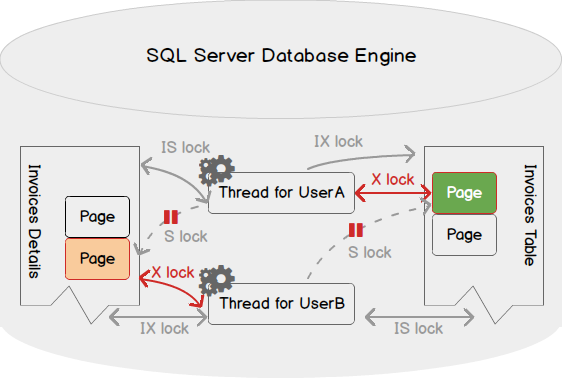 Let’s say that in order to modify a row in Invoice table, UserA must also read from an InvoiceDetails table to get the total that is billed to customer. Let’s say that, no matter the reason, UserB has already acquired an exclusive lock on a page containing a row of InvoiceDetails table that UserA needs to read.