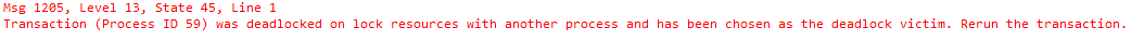 Once the deadlock victim is chosen, it will roll back the transaction of this victim and return a 1205 error message to the user. The error message looks like follows
