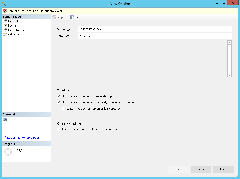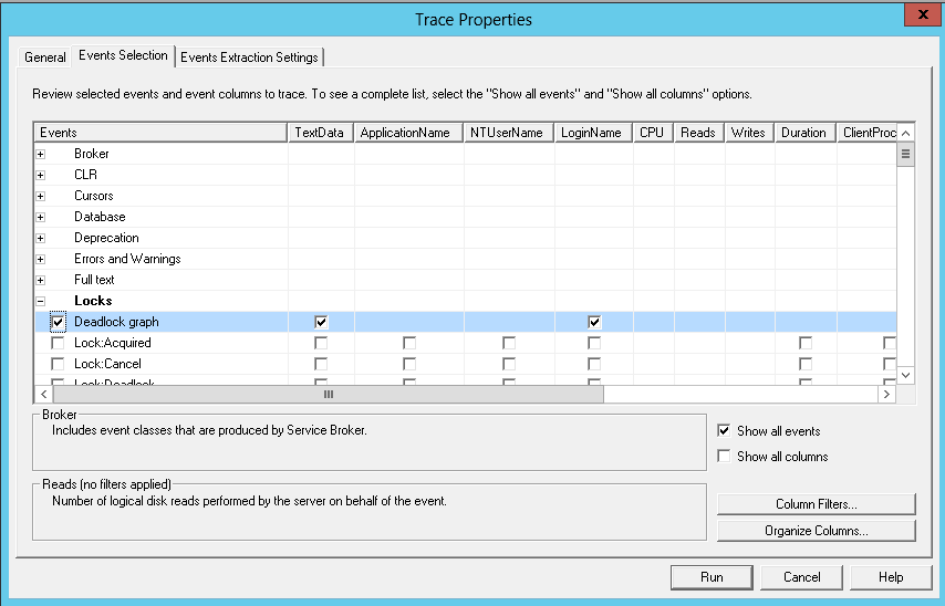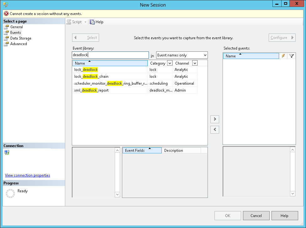 Now we set General parameters, let’s select events. There is a filter on the events view that will help us to only get the list of deadlock related events.